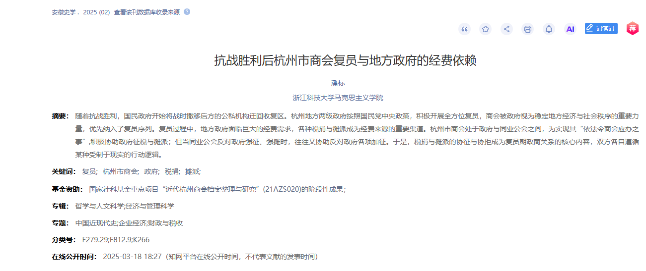 主要内容:随着抗战胜利,国民政府开始将战时撤移后方的公私机构迁回收复区。杭州地方两级政府按照国民党中央政策,积极开展全方位复员,商会被政府视为稳定地方经济与社会秩序的重要力量,优先纳入了复员序列。复员过程中,地方政府面临巨大的经费需求,各种税捐与摊派成为经费来源的重要渠道。杭州市商会处于政府与同业公会之间,为实现其“依法令商会应办之事”,积极协助政府征税与摊派;但当同业公会反对政府强征、强摊时,往往又协助反对政府各项加征。于是,税捐与摊派的协征与协拒成为复员期政商关系的核心内容,双方各自遵循某种受制于现实的行动逻辑。